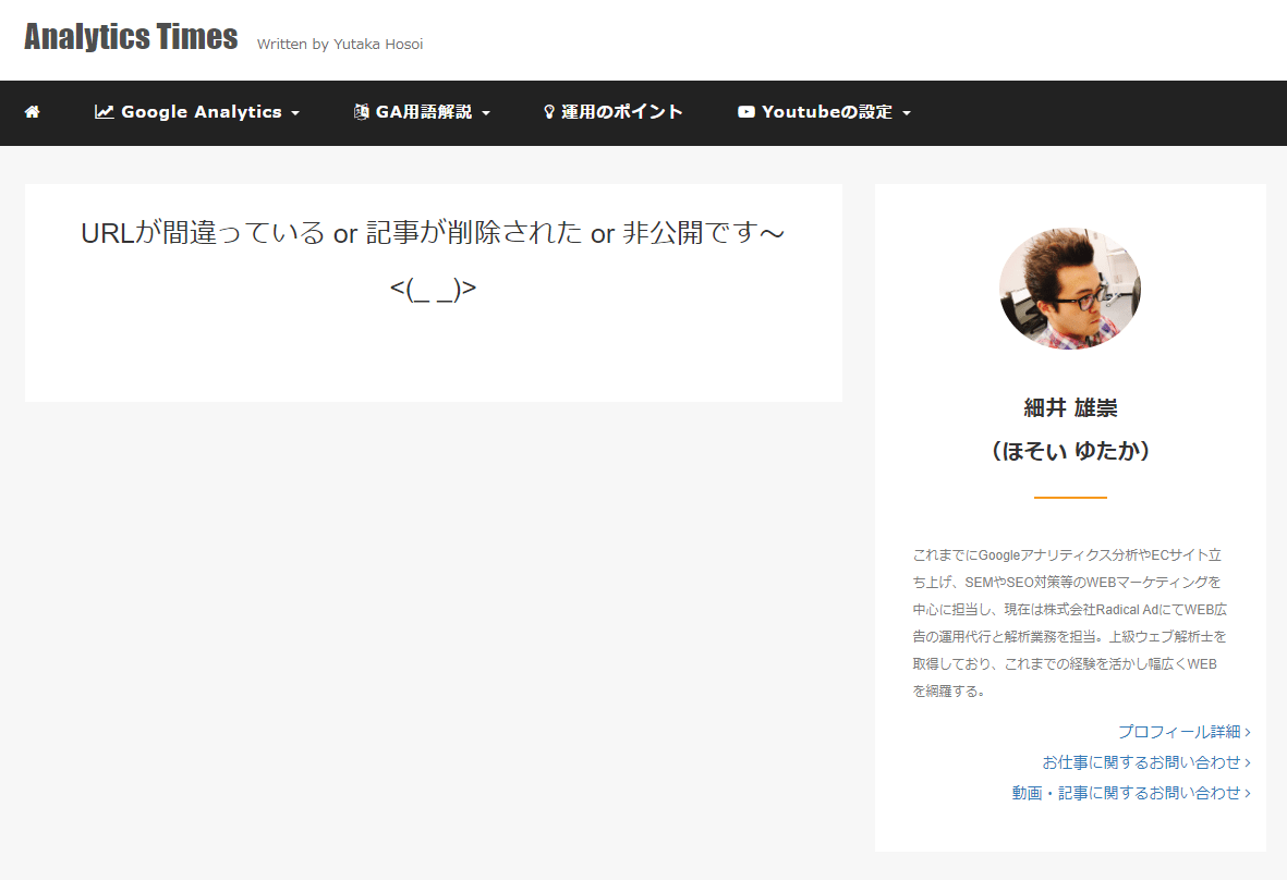 例えば僕がやっているAnalytics Timesの場合、URLを間違えて記載すると、以下のような「404」のページが表示されるとこのようなページが表示されます。